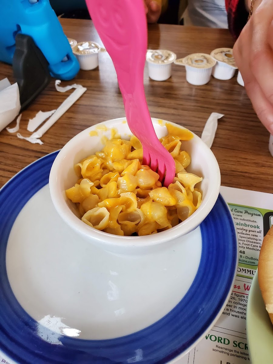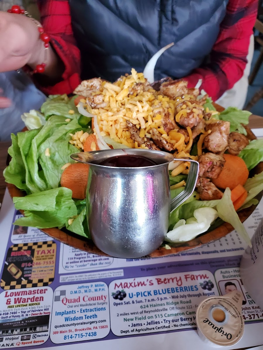 Nice inexpensive menu many good classic American foods. Large place plenty of seating great service. Large chicken salad 24 for two and a kid.